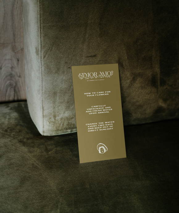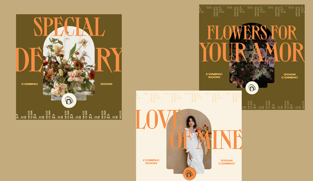 The experimental typography combination of Toy (a bold, high-contrast display face) paired with Outpost (a rugged, western-leaning font) created visual tension that kept the identity from skewing too sweet or traditional. Even the color palette was carefully desaturated—cosmic latte, cadmium orange, maximum yellow red, light French beige, and Spanish bistre—to keep things soft, earthy, and romantic rather than overly saturated or garish. Every element, from the arched care card shape to the vintage postage-inspired sticker designs, was crafted to make receiving an Amor Mio arrangement feel like unwrapping a special, thoughtfully designed gift.